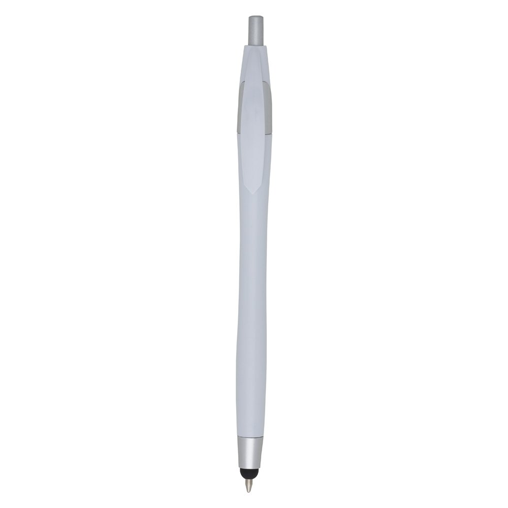 Caneta plástica com ponteira touch screen, carga esferográfica azul 1.0 mm e acionamento por clique.